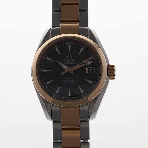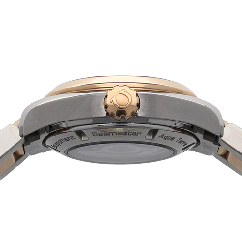 | モデル情報 | シーマスター アクアテラは、オメガが製造しているスポーツウォッチの一つで、海と陸のアクティブなライフスタイルに対応するデザインが特徴的です。 シンプルながらも洗練された外観が特徴的で、スポーティーな印象を与える一方、ビジネスシーンでも着用できる万能性も持ち合わせています。 こちらはステンレススティールとレッドゴールドのケースにストライプ模様が刻まれたグレー文字盤、バーインデックスが配置され、上品でラグジュアリーな印象を与えるデザインが魅力の一本となっております。 |
