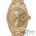 | モデル情報 | デイデイトは「金無垢」モデルのみであり、3時の位置に日付、12時の位置に曜日を表示する「デイデイト機構」を搭載し、曜日表示が26カ国以上の言語に対応しています。日付と曜日が真夜中に瞬時に切り替わる機能や、洗練された「プレジデントブレスレット」が特徴です。 こちらはデイデイトのベーシックラインである10Pダイヤ付のシャンパン文字盤となっております。 |